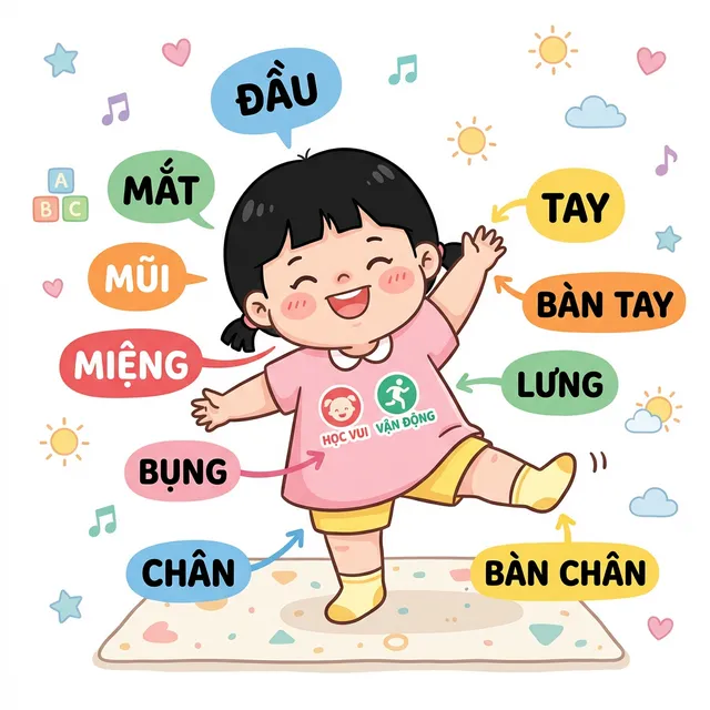 - Chức năng cơ thể: Bé không chỉ biết tên mà còn hiểu "Tay dùng để làm gì?", "Chân giúp mình như thế nào?"