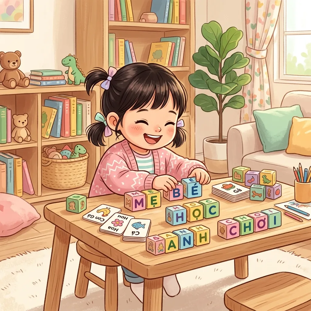 Chuẩn bị thẻ chữ cái rời bằng bìa cứng. Mỗi buổi học, bé cầm các thẻ và xếp chúng lại thành từ — trải nghiệm xúc giác giúp bé ghi nhớ tốt hơn rất nhiều so với chỉ nhìn và đọc.