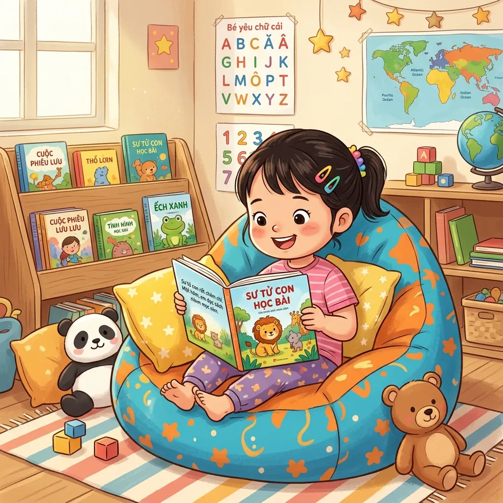Khi đọc truyện, hãy chỉ tay vào từng từ và đánh vần chậm. Bé sẽ dần nhận ra mối liên hệ giữa âm thanh nghe được và chữ viết trên giấy — đây chính là nền tảng của tập đọc sớm.