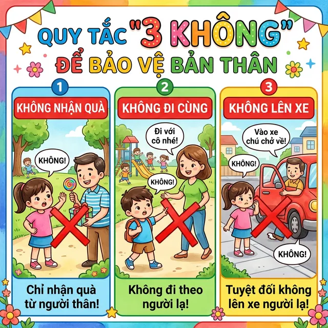 Cách xử lý đúng: "KHÔNG, cảm ơn bác!" → Chạy đến chỗ ba mẹ/cô giáo, kể lại.