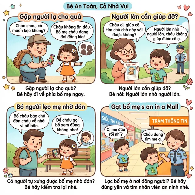Quy tắc bổ sung: Nếu ai đó cố nắm tay kéo con đi → HÉT THẬ TO: "CHÁU KHÔNG BIẾT NGƯỜI NÀY! GIÚP CHÁU VỚI!"