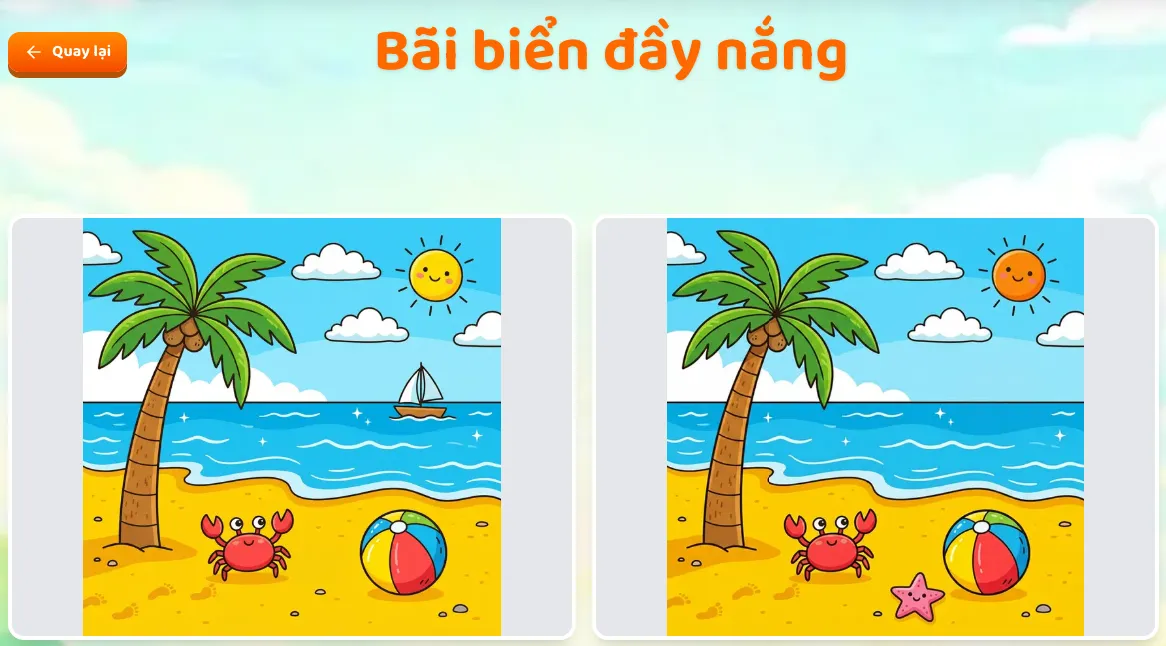 Trò chơi Điểm khác biệt đưa bé vào những bối cảnh sinh động từ phòng khách, khu vườn đến biển cả bao la.